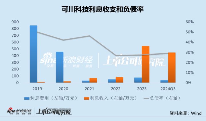财务数据显示,自2019年起,可川科技有息负债就降至很低的水平,特别是2022年上市后,由于IPO净融资5.28亿,公司负债率从46%大降至27%,利息费用大幅减少的同时,利息收入显著增加。